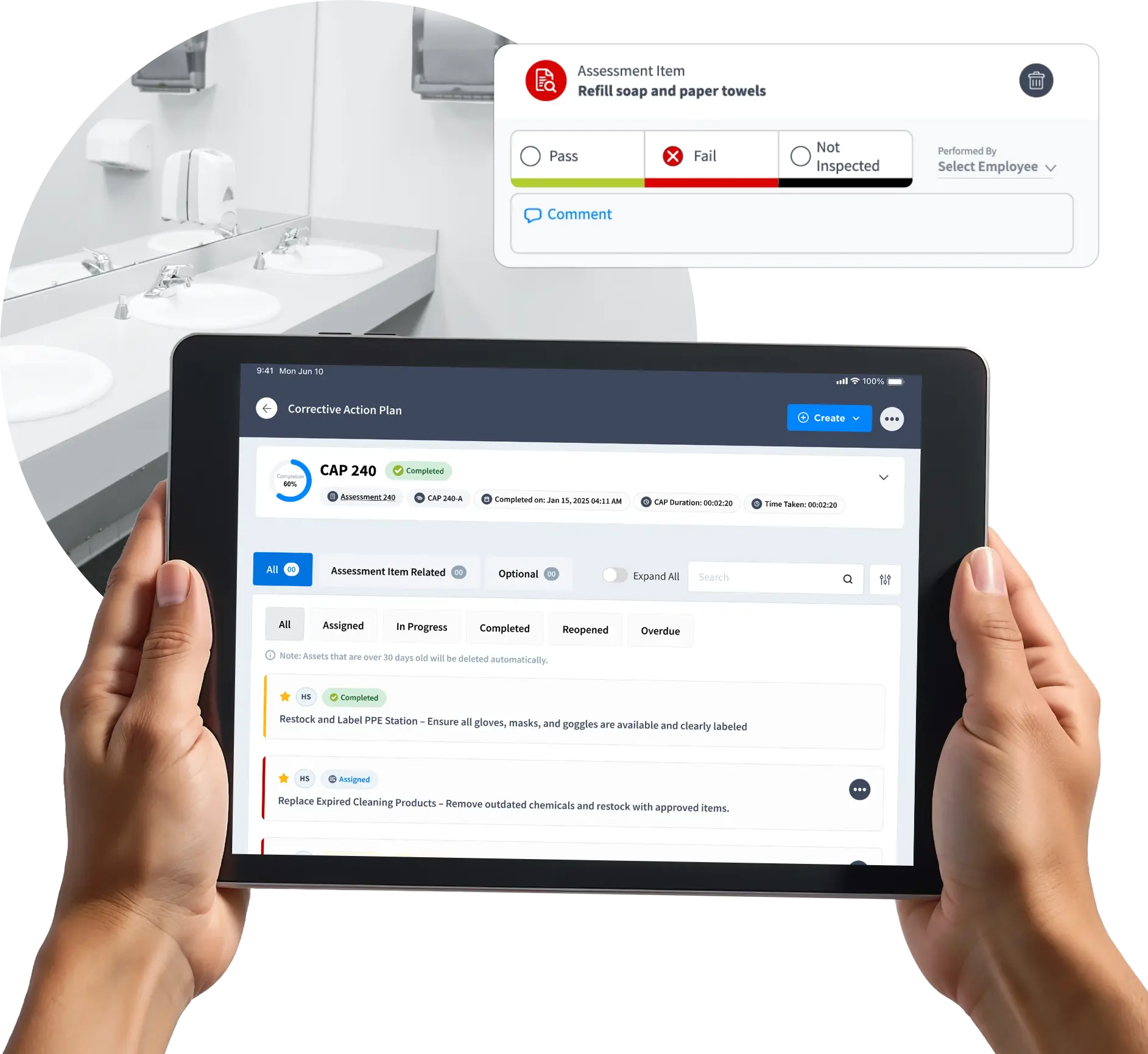Make updates hands-free with built-in voice input on mobile. Inspectors and cleaning staff can update tasks and assessments in real-time—even while on the move.
