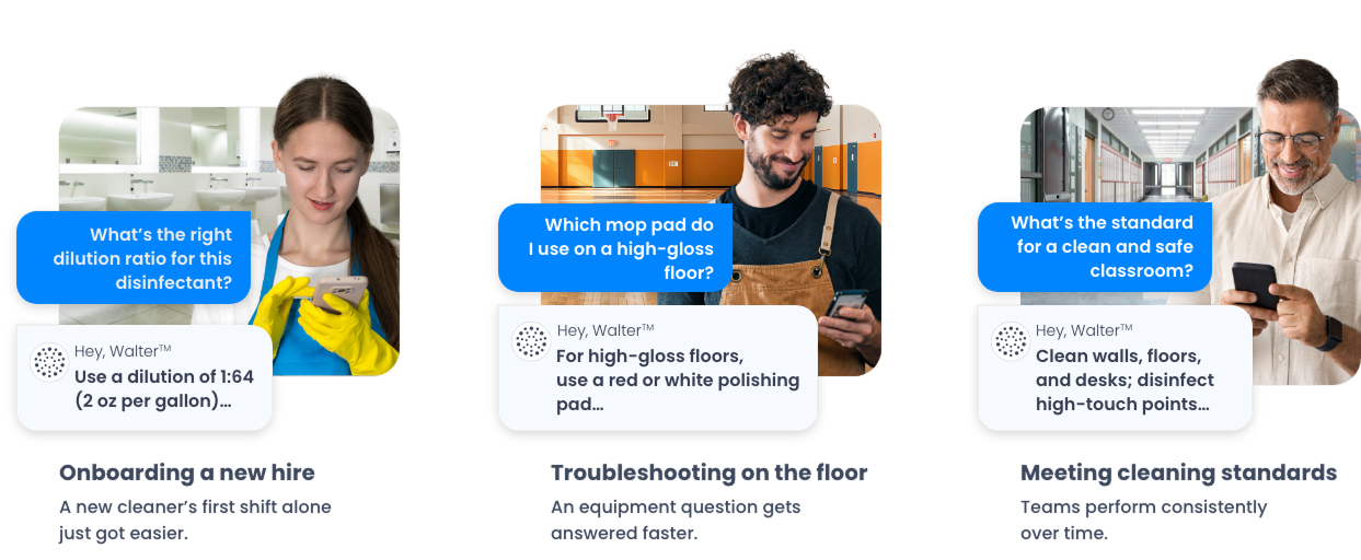 Hey, Walter™ turns complex cleaning procedures into step-by-step instructions, time studies, and training videos that make learning clear and repeatable for any team.
