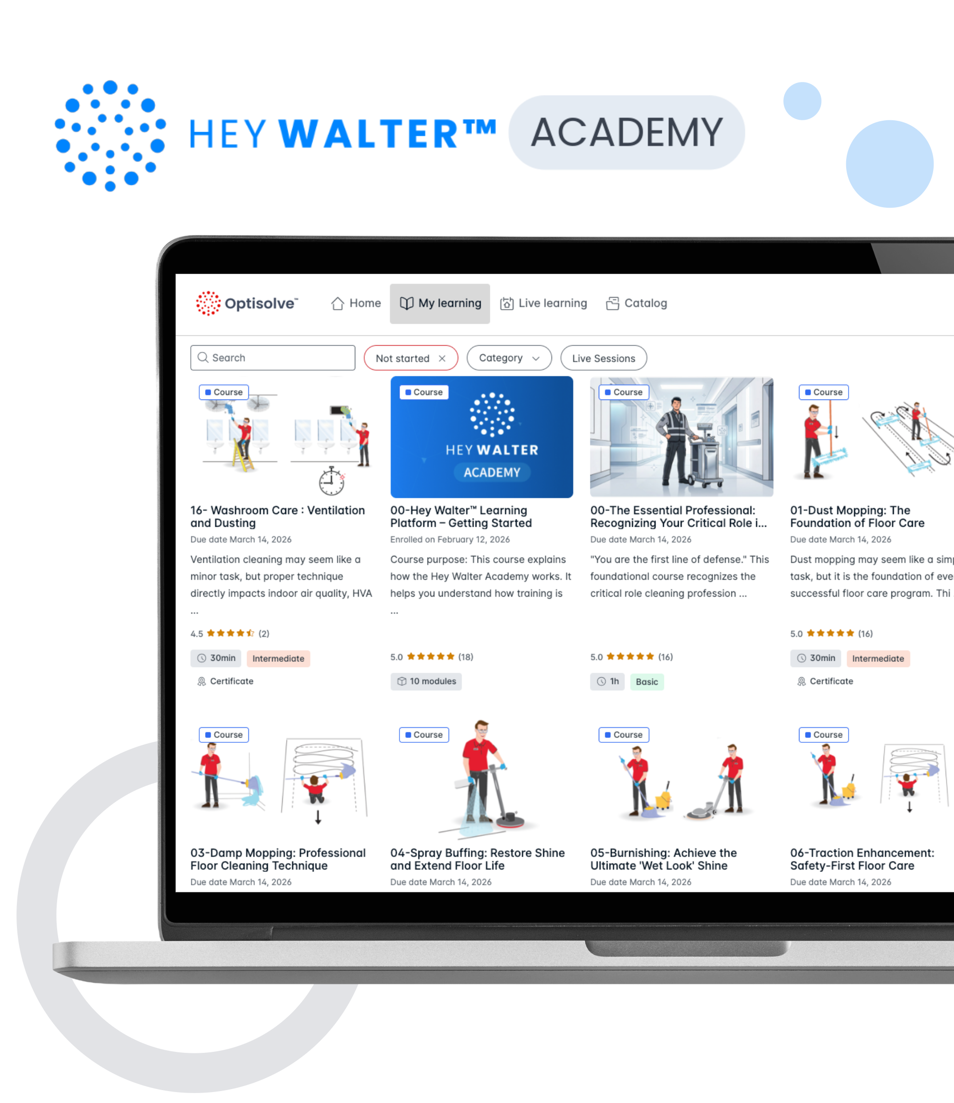 Hey Walter Academy™ is a professional online training and certification platform designed for cleaning and facility teams. It provides structured, SOP-based modules that align task execution across shifts, buildings, and teams. Available on mobile, tablet, and desktop, it delivers consistent, accessible training wherever work happens.